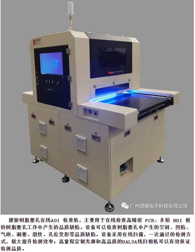 導(dǎo)語:捷駿最新研發(fā)的樹脂塞孔在線AOI 檢查機,主要用于在線檢查高精密 PCB、多階 HDI 板的樹脂塞孔工序中產(chǎn)生的品質(zhì)缺陷。設(shè)備可以檢查樹脂塞孔中產(chǎn)生的空洞、凹陷、氣泡、漏塞、裂紋、孔位變形等品質(zhì)缺陷。